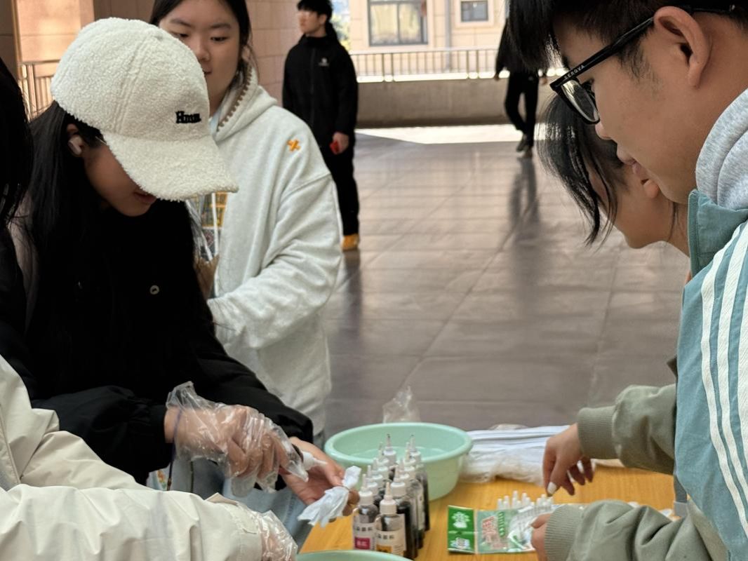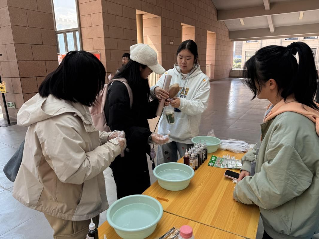当批量生产让物件失去新意,亲手触摸传统工艺的温度更显珍贵。在本次手作集市的扎染摊位上,非遗技艺成为纽带,引领同学们体验布料染色的奇妙过程。一折一捆、一浸一晾之间,东方美学的独特韵味悄然绽放,为现场增添了一抹质朴而鲜活的色彩。