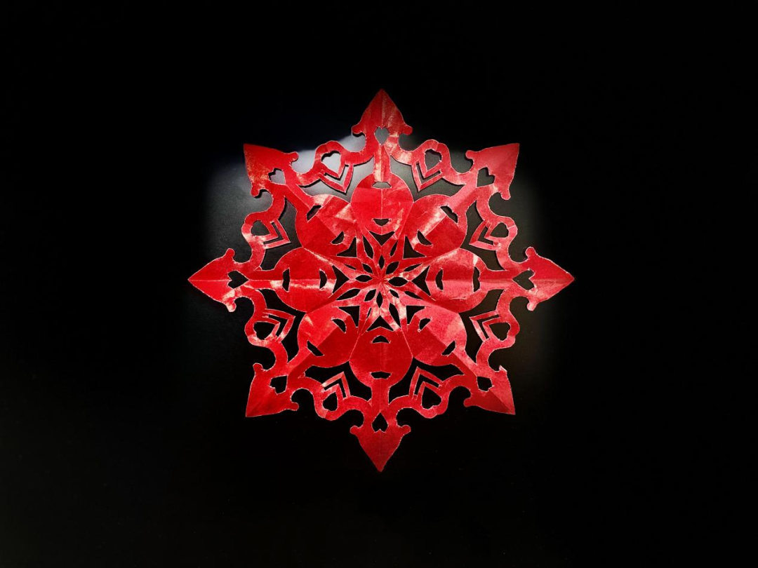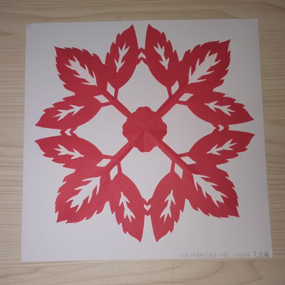 ②以花为主,三角为辅,后以白色为纸材,蓝色为背景,借以道教三生万物的理念,一朵花需要以无数的花瓣才能成为一个整体,用花象征着全国各族人民团结一心,繁荣昌盛的美好祈愿。