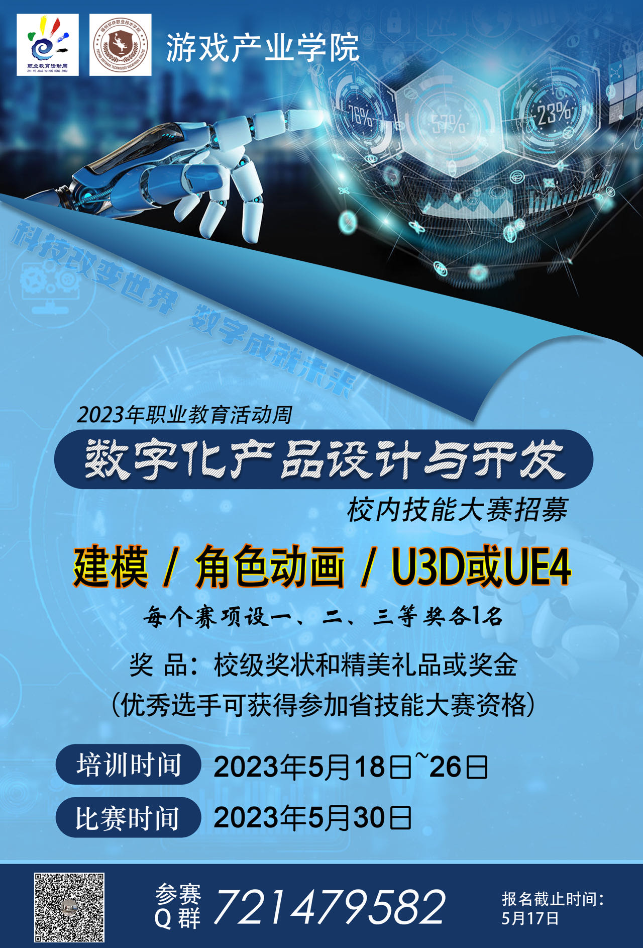 为贯彻落实党的二十大精神,落实《关于做好2023年职业教育活动周相关工作的通知》(教职成函〔2023〕5号)等系列通知,响应我校开展2023年职业教育活动周系列活动的要求,我院现开设数字化产品设计与开发大赛。本赛项以数字化产品设计与开发行业典型项目为背景,以数字化产品设计与制作、数字化产品动作交互制作、数字化产品应用与开发为技术模块,以数字化产品设计与开发中的典型案例和虚拟现实技术应用专业核心教学内容作为竞赛内容,竞赛方式和竞赛内容对标全国职业技能大赛。本赛项主要考查参赛学生虚拟现实与增强现实引擎、三维建模与动画、交互设计等方面的知识。具体通知如下: