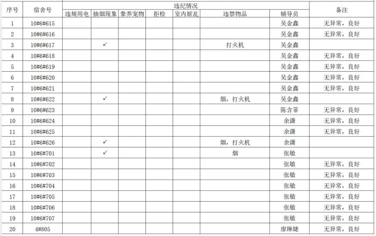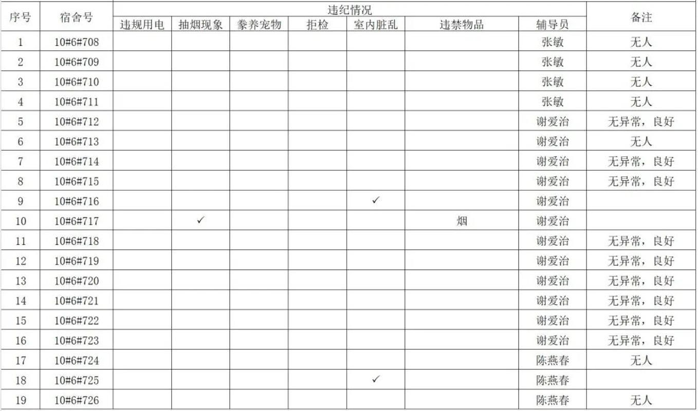 在本周的宿舍抽查情况中,发现部分宿舍存在垃圾堆放的不文明行为,以及持有香烟、打火机等违规物品。上述违纪行为已通知相关辅导员进行督促整改。请同学们引以为戒,养成“日产日清”的习惯,及时清理垃圾,避免长时间堆放;自觉遵守相关校规校纪,共同维护校园秩序。