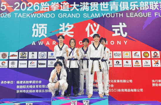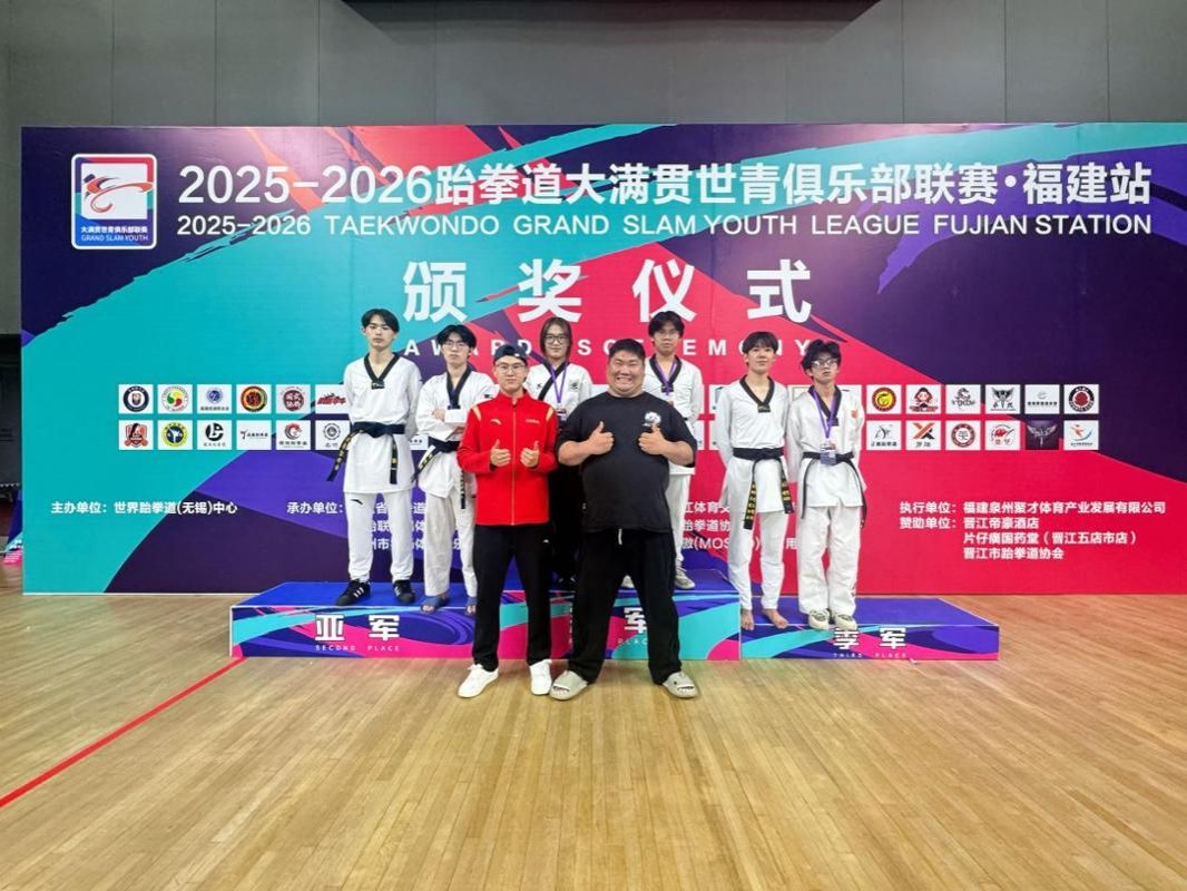 2025年12月6日至7日,由福建省跆拳道协会组织的2025-2026年跆拳道大满贯世青俱乐部联赛在泉州市晋江市第二体育中心1号馆圆满落幕。我校游戏产业学院运动训练教师颜世童、军体教研部教师冯一龙两位老师带队出征,6名参赛学子奋勇拼搏、不负众望,全部斩获名次,最终以1金2银3铜的优异成绩为学校争光添彩!