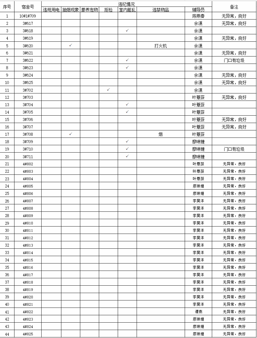 在本周的宿舍抽查情况中,发现部分宿舍存在垃圾堆放的不文明行为,以及持有香烟、打火机等违规物品,上述违纪行为已通知相关辅导员进行督促整改。请同学们引以为戒,养成“日产日清”的习惯,及时清理垃圾,避免长时间堆放;自觉遵守相关校规校纪,共同维护校园秩序。