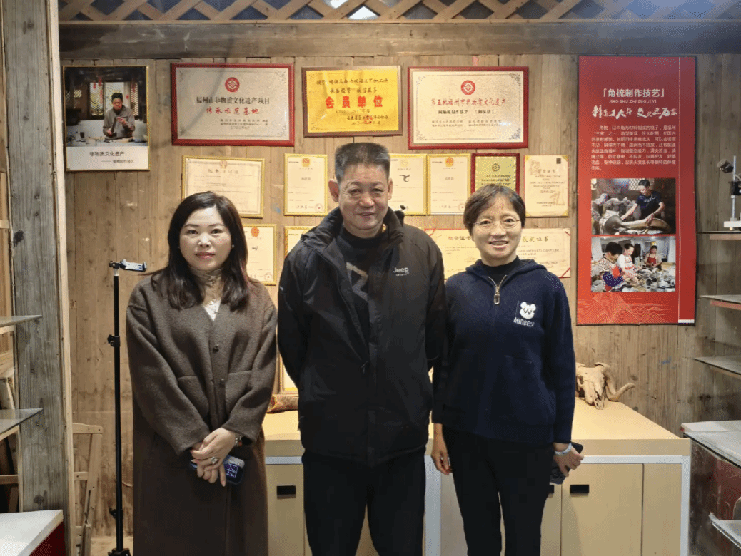 2025年12月28日,我校党委常务副书记林莺、校长助理李榕玲等一行走访牛角梳非遗传承人陈连信工作坊,进行实地调研与校企合作洽谈。