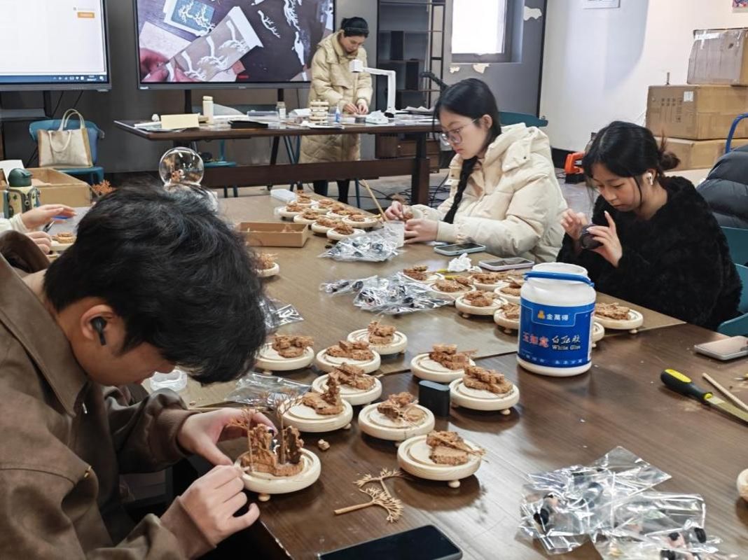 △图为游戏产业学院与“李榕玲数字非遗名师工作室”师生制作侯德榜故居软木画文创产品