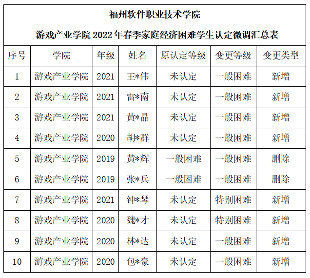 根据福建省教育厅等九部门关于印发《福建省家庭经济困难学生认定办法(试行)》(闽教学〔2019〕 21号)、《福建省教育厅等四部门关于调整职业院校奖助学金政策的通知》(闽教学〔2019〕23号)和《福州软件职业技术学院家庭经济困难学生认定办法(试行)的通知》(福软学〔2019〕59号),游戏产业学院开展2022年春季家庭经济困难学生认定微调工作,经过前期通知、学生个人申请、班级民主评议、辅导员及院系意见审核,现将初审名单进行公示,公示期三天(2022年3月30日-4月1日)。