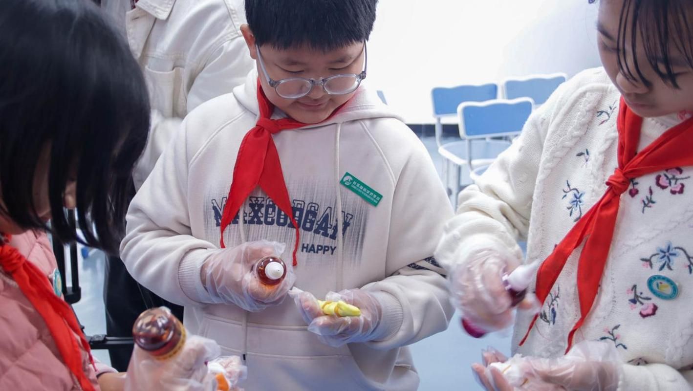 当科技体验余韵未消,另一场跨越古今的文化之旅随即展开。在“一绢一染,拾趣时光”非遗课堂上,主讲人黄铮腾借助图文并茂的PPT,向学生生动讲述扎染技艺的悠久历史与精湛工艺。随后,在志愿者协助下,同学们动手折叠、捆扎素白方巾,并浸入染液。随着布料展开,一幅幅色彩斑斓、纹样独特的扎染作品跃然眼前,每一幅都是独一无二的艺术创造,孩子们在亲手实践中直观领略非遗之美,心底的文化自信悄然生长。