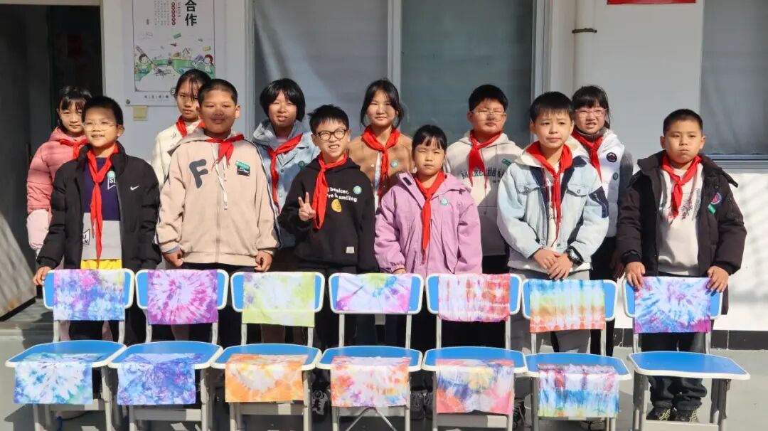 当科技体验余韵未消,另一场跨越古今的文化之旅随即展开。在“一绢一染,拾趣时光”非遗课堂上,主讲人黄铮腾借助图文并茂的PPT,向学生生动讲述扎染技艺的悠久历史与精湛工艺。随后,在志愿者协助下,同学们动手折叠、捆扎素白方巾,并浸入染液。随着布料展开,一幅幅色彩斑斓、纹样独特的扎染作品跃然眼前,每一幅都是独一无二的艺术创造,孩子们在亲手实践中直观领略非遗之美,心底的文化自信悄然生长。