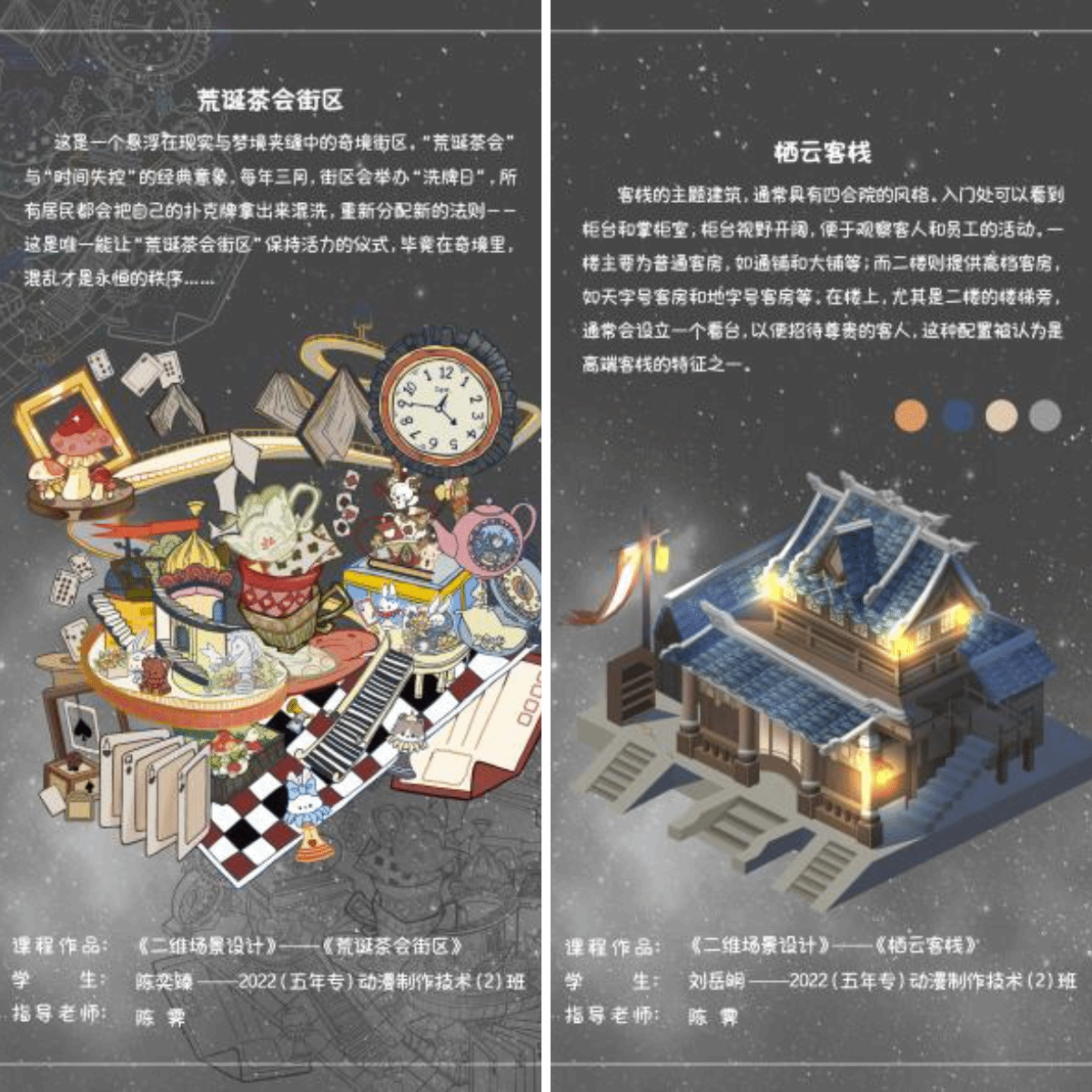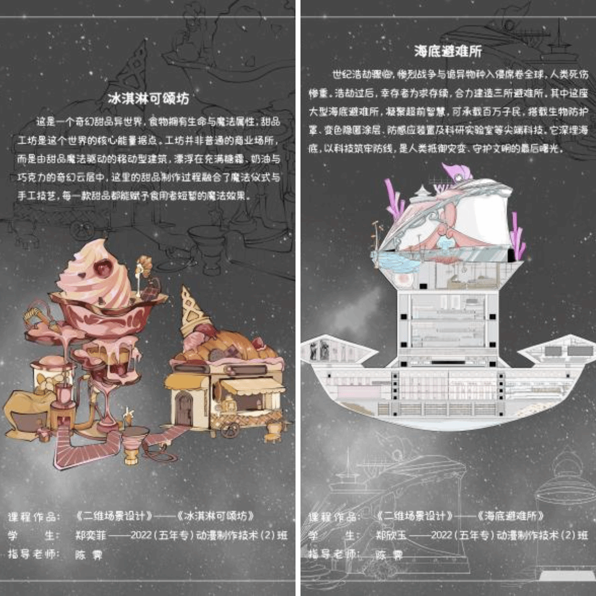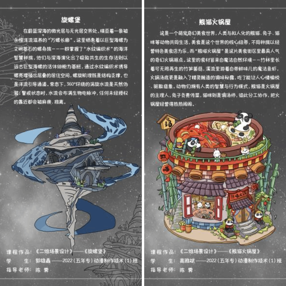 《二维场景设计》为职业核心课程,共48学时,依托前置课程,聚焦透视、光影及风格化表现,尤其注重Q版风格系统训练。参展作品构思精巧,体现了学生扎实的造型能力与空间组织力。