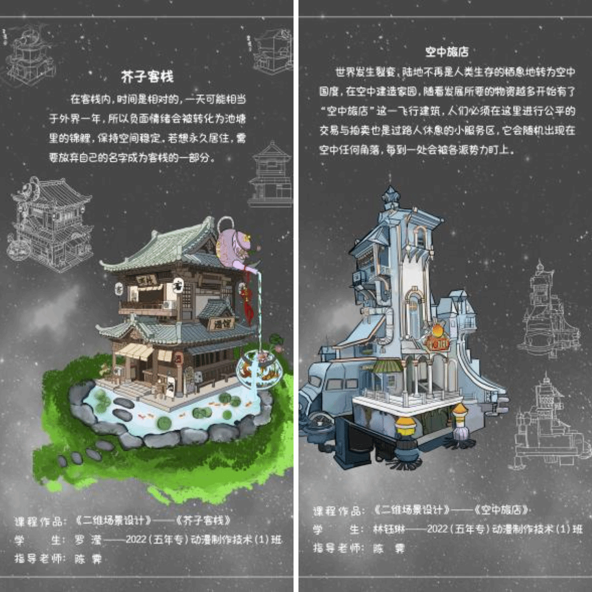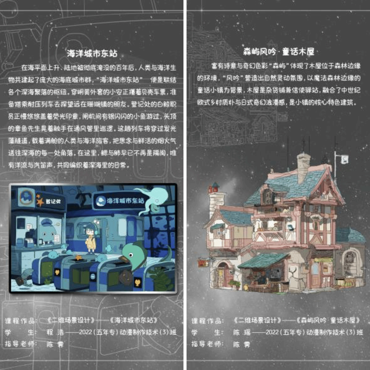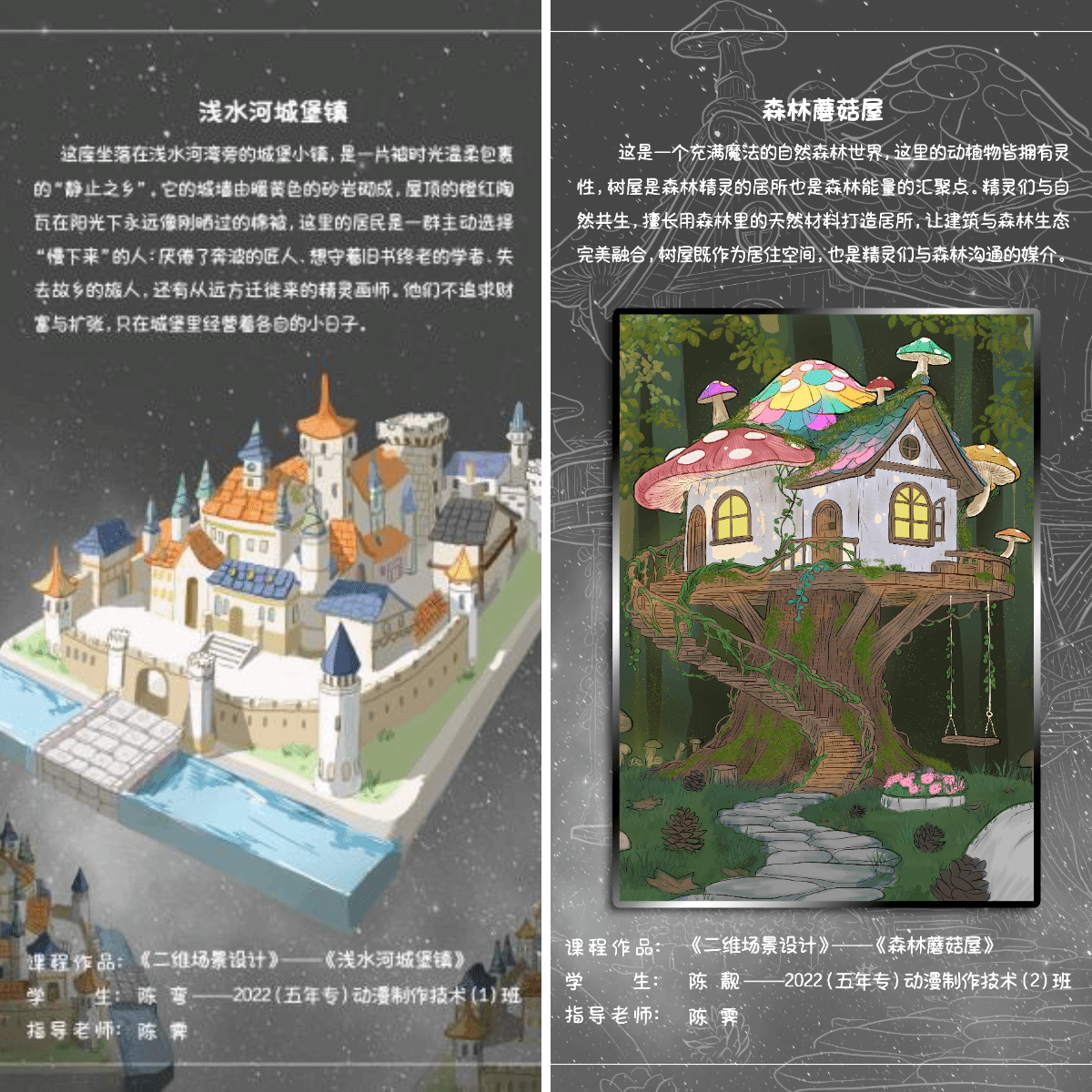 《二维场景设计》为职业核心课程,共48学时,依托前置课程,聚焦透视、光影及风格化表现,尤其注重Q版风格系统训练。参展作品构思精巧,体现了学生扎实的造型能力与空间组织力。