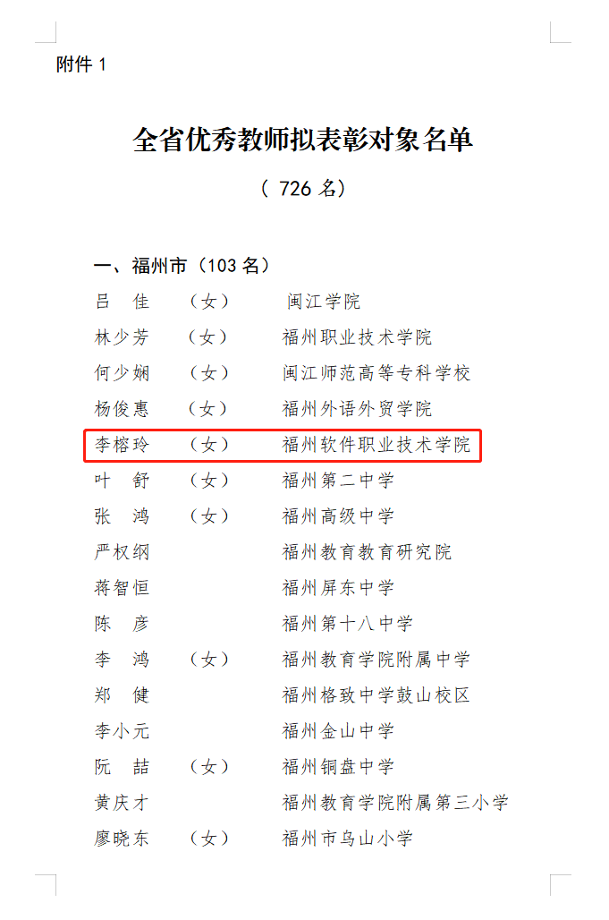 8月16日,福建省人力资源和社会保障厅、福建省教育厅发布《关于全省优秀教师和优秀教育工作者拟表彰对象的公示》,福州软件职业技术学院游戏产业学院李榕玲院长荣获2023年福建省优秀教师称号。