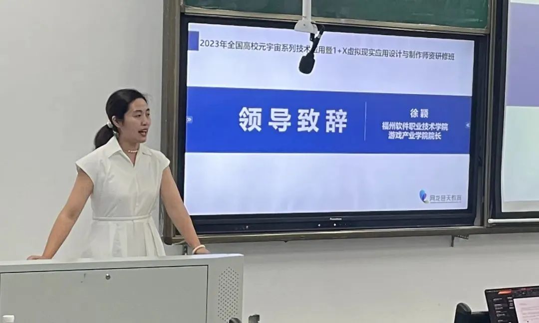 7月18日,由福建省网龙普天教育科技有限公司与福州软件职业技术学院联合开展的2023年全国元宇宙系列技术应用暨1+X虚拟现实应用设计与制作师资研修班开班仪式在福州软件职技术学院成功举办。福州软件职业技术学院游戏产业学院副院长徐颖以及福建省网龙普天教育科技有限公司项目经理田明月等老师应邀出席了开班仪式并致辞。