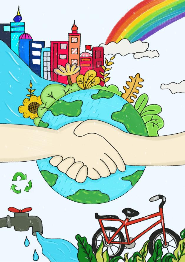 ②以蓝色和绿色为主基色调,中间融入了地球、人类和自行车等元素,表达地球、人与自然应当和谐共处。