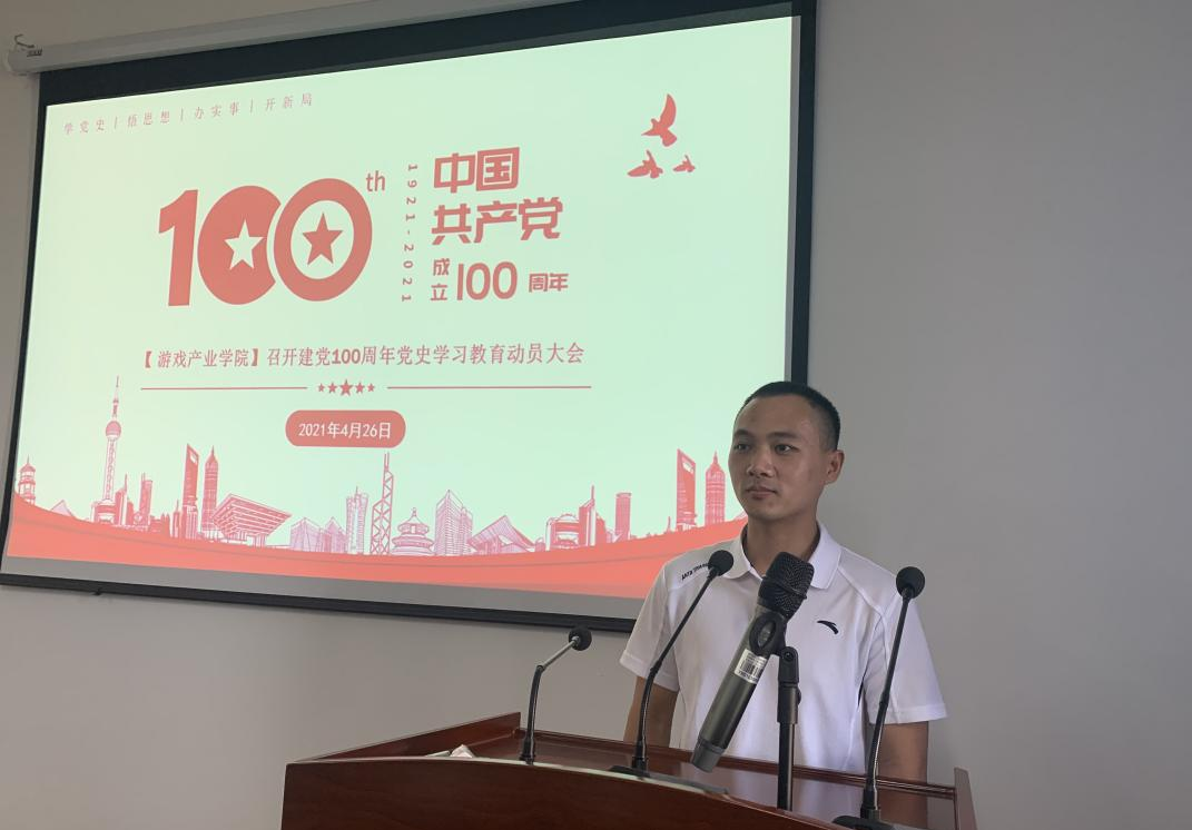 会上,游戏产业学院党总支副书记陈清华做庆祝中国共产党成立100周年党史学习教育动员讲话,他提到,为了进一步加强党史学习教育和庆祝建党100周年,结合实际,向全体师生党员就党史学习教育提出以下几点要求:1、认识党史学习教育的重大意义。2、明确学习目标,做到学史明理、学史增信、学史崇德、学史力行。3、突出学习内容。强调党史学习教育贯穿2021年全年,突出学党史、悟思想、办实事、开新局,注重融入日常、抓在经常,面向全体师生党员。以全面学习党史为重点,深入了解党的百年奋斗史,深化对马克思主义中国化成果特别是习近平新时代中国特色社会主义思想的理解。重点学习习近平总书记在庆祝中国共产党成立100周年大会上的重要讲话精神,并以此为指导不断深化对党的历史的系统把握,明确继承传统、立足当前、开创未来的实践要求。